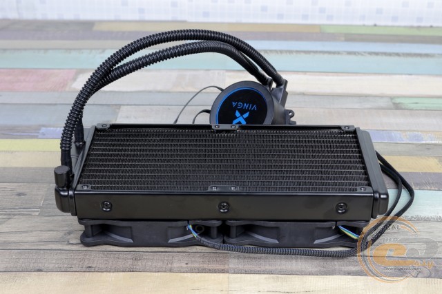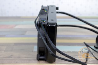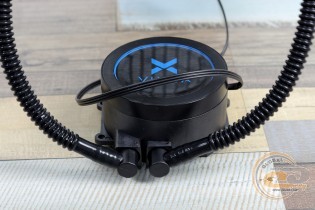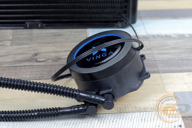Зовні водоблок повністю аналогічний такому в молодшому рішенні Vinga Sea, хоча розміри все ж дещо відрізняються: маємо 78 х 72 х 41 мм. Невелика округла коробочка без проблем дозволить застосовувати планки пам'яті з великими радіаторами – ще одна беззаперечна перевага СВО над громіздкими повітряними охолоджувачами. Глянсова вставка несе на собі логотип виробника, обладнаний м'яким синім підсвічуванням. Єдине «але» – розмістити його варто було б з поворотом на 90°, оскільки в поточному вигляді при монтажі напис буде лежатиме на боку.