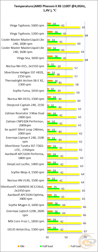 Зменшення частоти обертання лопатей до 1200 об/хв збільшує відставання ще на 2-3°C, проте такий режим ще дозволяє ефективно охолоджувати розігнані високопродуктивні процесори минулих поколінь. А значить, енергоефективніші сучасні моделі також будуть новинці під силу, навіть при зниженій швидкості обертання.