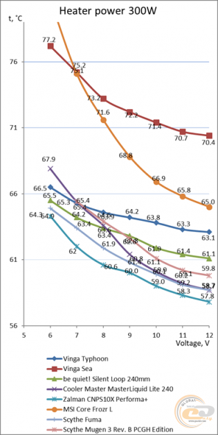 Тестування Vinga Typhoon на 300-Вт нагрівальному стенді показує залежність, близьку до лінійної. Отже, використання вентиляторів навіть при невисокій частоті дозволить ефективно відводити тепло від процесорів.