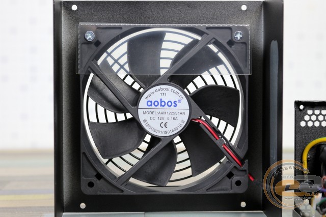 Обдувати нутрощі покликана 120-мм вертушка Aobos AAM1225S1AN (12 В, 0,16 А, 1,92 Вт), очевидно, заснована на підшипнику ковзання. Рішення з аналогічним позначенням ми вже бачили всередині 550-ватного БЖ Vinga VPS-550G, проте там воно споживало трохи більше електроенергії - 2,64 Вт.