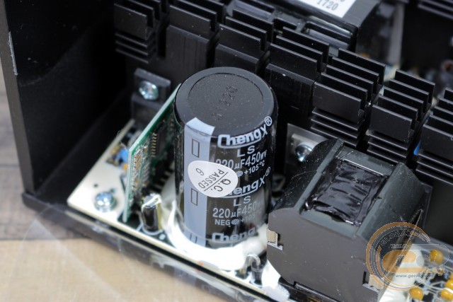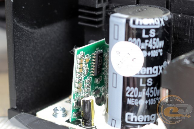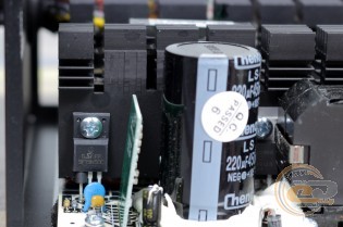 Поруч з дроселем модуля APFC розмістився вхідний електроліт ChengX (220 мкФ х 450 В). На упаковці заявлено використання тайванських конденсаторів, проте визначити місце виробництва даного елемента нам не вдалося. У мережі його якість оцінюється як низька. Що стосується ємності в 220 мкФ, то це відносно невеликий показник. Усередині 500-Вт рішень навіть бюджетного рівня часто зустрічаються елементи на 270-330 мкФ. А ось приналежність до високотемпературної серії все ж дає хоч якийсь привід для радості при огляді даного вузла.