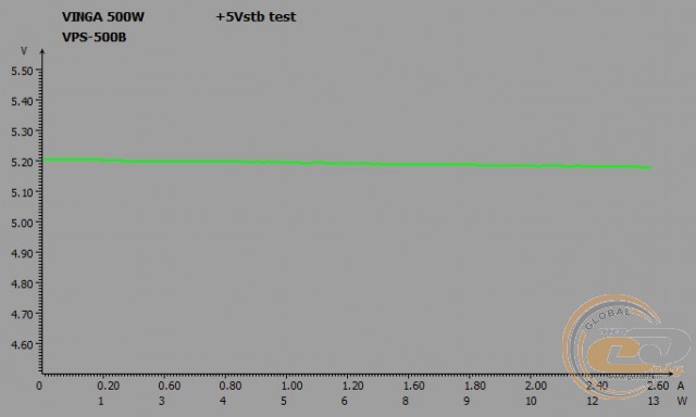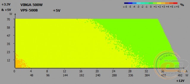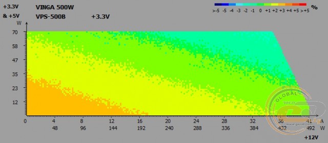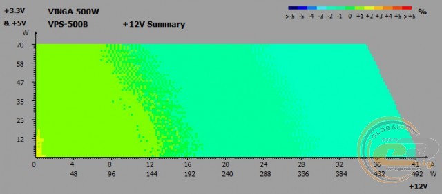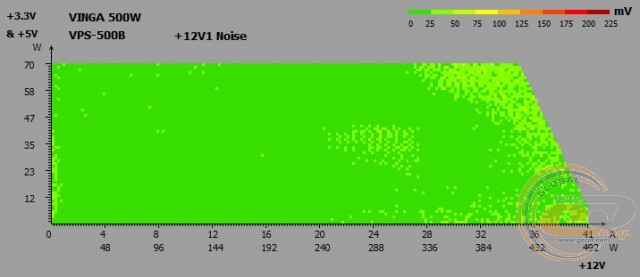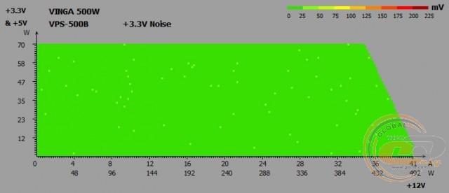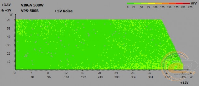 Вихідні напруги Vinga VPS-500B при тестуванні на реальній конфігурації не виходять за межі допустимого діапазону. І під навантаженням (режим «Burn»), і при бездіяльності системи (режим «Idle») немає ніяких просідань нижче від номіналу, та й самі відхилення в максимум в 0,02 В дуже і дуже малі. Ось тільки показники лінії +3,3В все ж впритул підходять до максимально допустимої позначки 3,47 В.