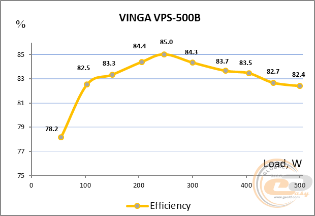 А як тут йдеться з енергоефективністю? Ми за традицією перевірили даний момент, і Vinga VPS-500B не дає приводу для занепокоєння - пристрій цілком відповідає заявленому стандарту 80 PLUS Bronze.