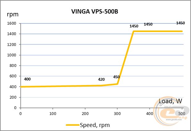 Вертушка в блоці живлення Vinga VPS-500B налаштована досить цікаво. При навантаженні до 300 Вт вона дуже тихо обертається на частоті 400-450 об/хв. Далі швидкість пропелера різко підвищується в діапазоні від 300 до 345 Вт, виходячи на номінальний режим 1450 об/хв. Після цього при підвищенні навантаження частота обертання не змінюється, а шум залишається дуже комфортним, на рівні нижче середнього.