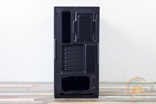 Задня панель – це місце для встановлення ще одного пропелера, на цей раз лише 120-мм, регулювати висоту розташування якого можна в доволі широкому діапазоні. Нижче розміщені сім слотів розширення з багаторазовими перфорованими заглушками та посадкове місце для БЖ.
