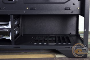 У ньому передбачене посадкове місце для довгого джерела живлення (оснащене елементами для поглинання вібрації) і пари 3,5" накопичувачів. Перший може сягати в довжину вражаючих 232 мм, однак з огляду на необхідність додаткового місця для вихідних кабелів ми б радили обмежитися 190-мм моделями.