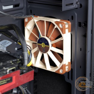 Перевагою Vinga Black Widow над породистим шведом є наявність передніх дверцят із шумоізоляцією, за якою ховаються два 5,25-дюймових відсіки. Також тут розміщена вентиляційна решітка, що прикриває посадкові місця для пари 140- або 120-мм пропелерів. Нижній з них і обдуватиме розташовані в лотках жорсткі диски. Попередньо встановлених вентиляторів тут немає – їх купівля лягає на плечі та гаманець користувача. Зате це дозволить підібрати рішення, які максимально відповідають індивідуальним вимогам.