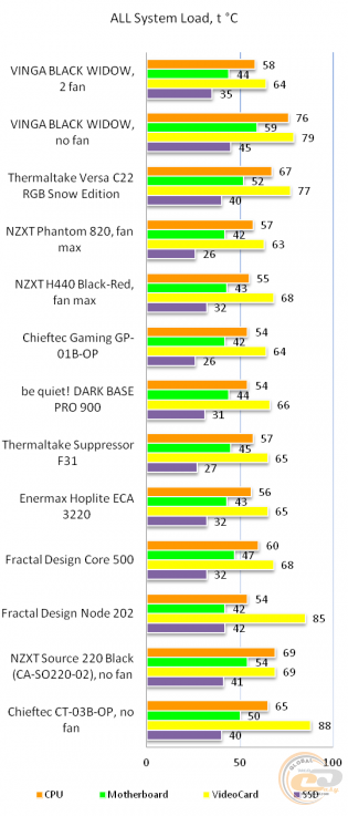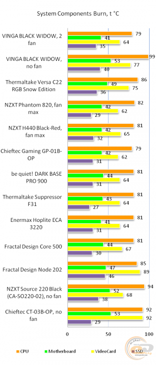 Без пропелерів даний корпус Vinga Black Widow складно рекомендувати для потужних комплектуючих. Температура відеокарти не виходить за допустимі межі, проте вона помітно підвищується. А ось нагрівання процесора при використанні охолоджувача з низькою частотою обертання взагалі доходить до значень, при яких запускається пропуск тактів.