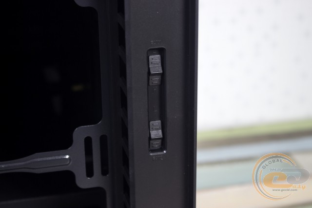 За дверцятами також розташовані два перемикачі швидкості обертання вентиляторів. Кожен з них має три положення: подача напруги 12 В (верхнє), вимкнено (середнє) і подача 5 В (нижнє). Всього до них можна під'єднати до п'яти вентиляторів, що дозволить організувати дуже гнучке роздільне охолодження з можливістю повного відключення додаткових пропелерів при малих навантаженнях. Втім, не всі пропелери можуть працювати при вхідній напрузі 5 В, що варто врахувати при їх підборі.