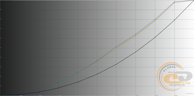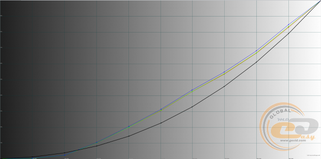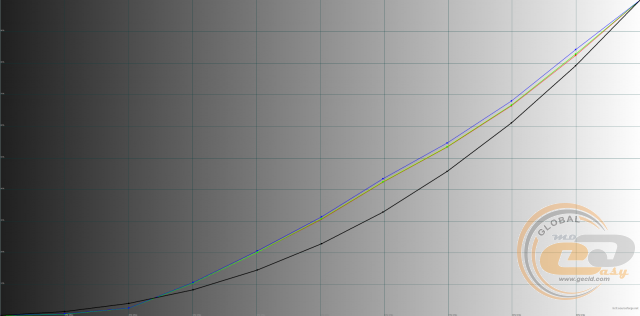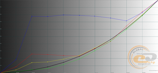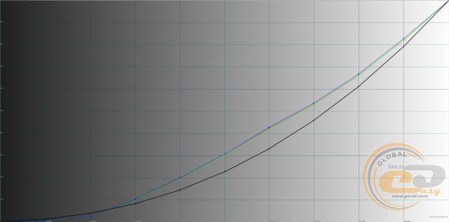 У всіх профілях гама-криві знаходяться вище еталонної чорної лінії, що може послужити причиною пересвічування напівтонів і втрати деталей на світлих ділянках зображення. Найкраща в цьому плані ситуація з профілем «Помірний», а найгірше впорався «Динамічний».