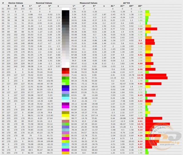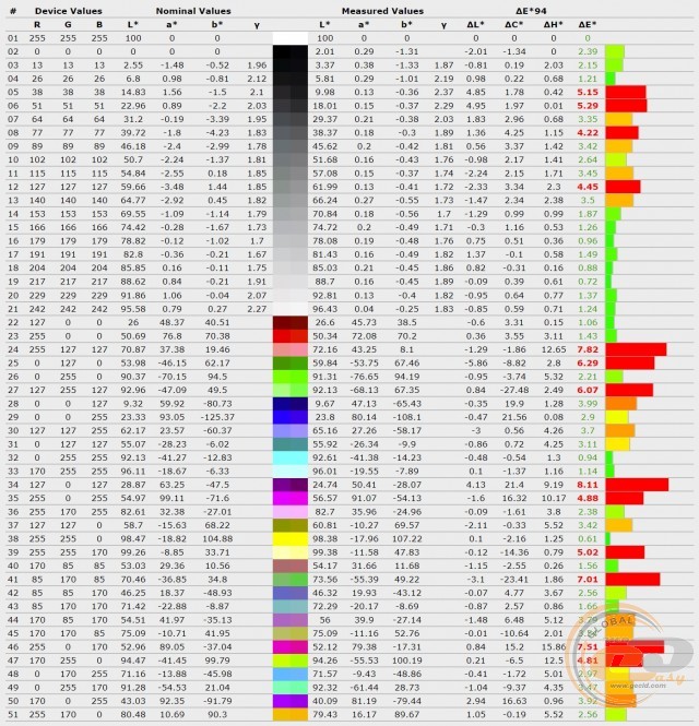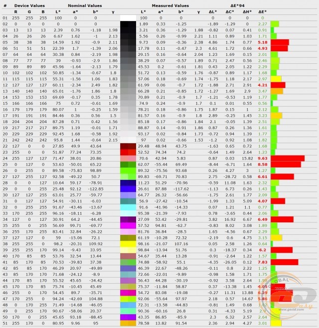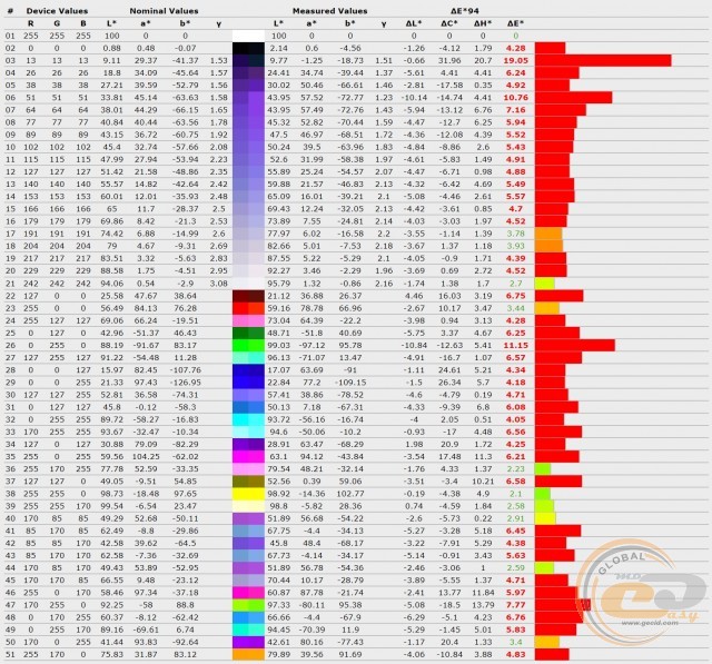 Жоден з профілів не зміг забезпечити необхідні критерії для досягнення необхідної точності передачі кольорів і відтінків: середнє та максимальне відхилення ΔE були вищі 1,5 і 4 відповідно. Найбільше «відзначився» профіль «Стандартний», хоча його сусіди не втекли далеко вперед.