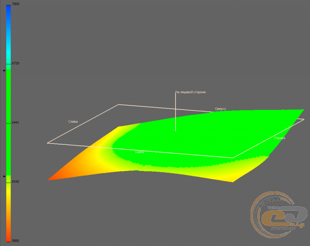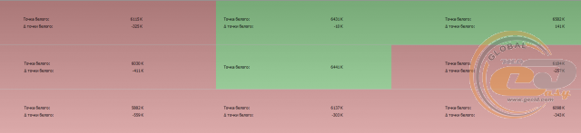 А ось із температурою точки білого не все так гладко: в шести з дев'яти умовних зон відхилення перевищує допустимий діапазон ±250 К, що відображено на 3D-діаграмі.