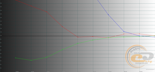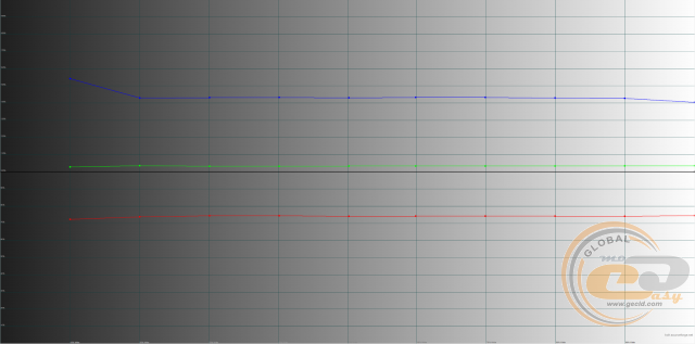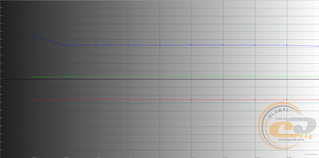 Налаштування рівнів RGB також далеке від ідеалу: лише зелена крива наближається до еталонної лінії 100%. У свою чергу червона складова занижена (знаходиться між 70% – 80%), а синя – завищена (перевищує 140%). В результаті картинка буде здаватися холодною і краще підійде для відтворення води, льоду, неба тощо.