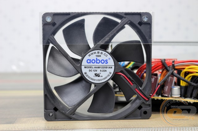 Внутрішні компоненти обдуваються за допомогою 120-мм вентилятора Aobos AAM1225S1AN (12 В, 0,22 А, 2,64 Вт) на основі вольниці ковзання. З огляду на цінник даного БЖ, це цілком закономірно. А ось беручи до уваги його розміри, сюди можна було б вмістити й 140-мм пропелер.