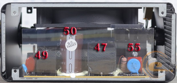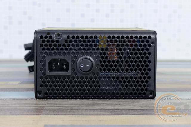 Перфорована нижня панель є незнімної частиною корпуса. З точки зору захоплення та виведення нагрітого повітря компонування цілком стандартне. Лише замість отворів у вигляді стільників тут кола – більшого діаметру по центру та меншого біля боковин. На місці вхідний мережевий роз'єм і кнопка ввімкнення.