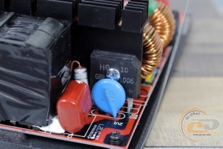 Для випрямлення напруги використовується пара діодних збірок GBU1006. Кожна з них розрахована на 10 А. Охолодження за допомогою головного радіатора радує, а ось спосіб кріплення їх обох з одного боку - не дуже. Цей же охолоджувач відводить тепло від силових елементів високовольтної частини, у числі яких транзистори Infineon 5R140P.
