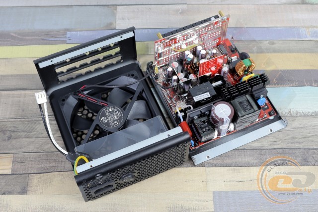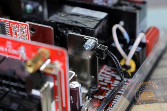 Щоб насолодитися красою нутрощів новинки, нам довелося відкрутити в цілому 14 гвинтів: 10 на боковинах і 4 на панелі з наклейкою. Відразу ж відзначимо цікаву форму використовуваного радіатора: гребінці є тільки в першій його частині, тоді як друга (яка якраз ближче до гарячих силових елементів) виконана у вигляді звичайної пластини.