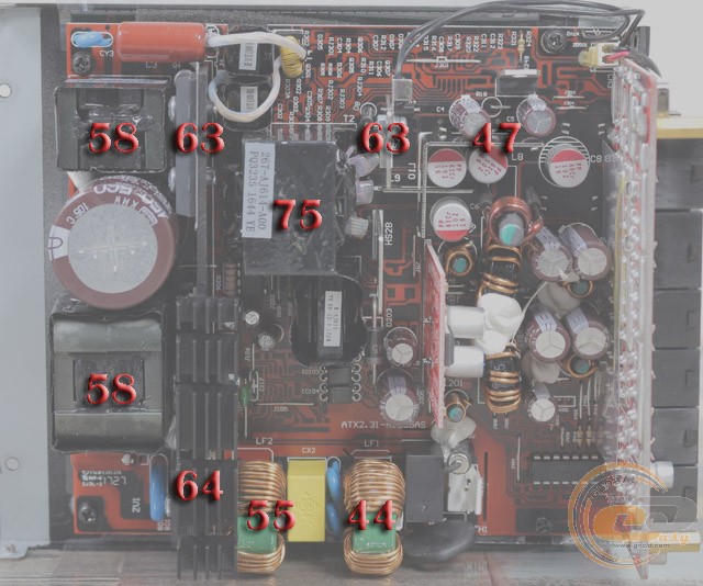 Поруч помістилася частина EMI-фільтра, що складається з двох Y- і одного X-конденсатора. Далі до головної друкованої плати живлення подається через 3-контактний конектор, в якому задіяно два крайніх роз'єми.