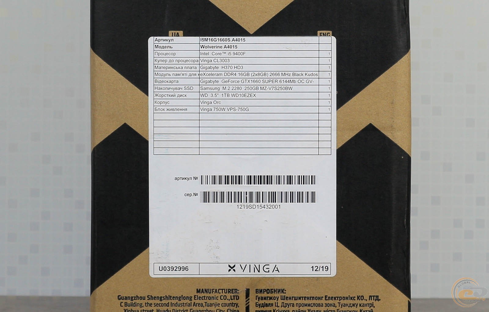 На одній із боковин упаковки є наклейка з конфігурацією зібраної системи, серійним номером та іншою інформацією.