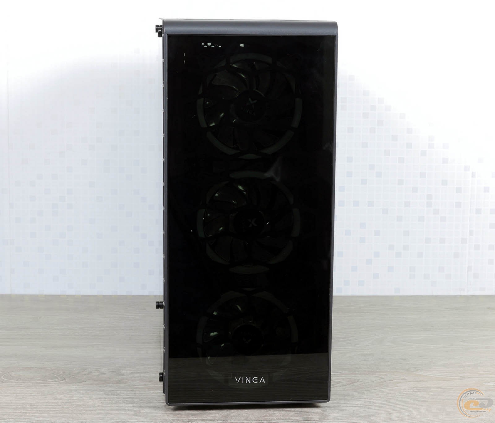 Уся зверхня панель корпуса прикрита затемненим склом товщиною 4 мм. Вона знімається тільки для встановлення фронтальних вентиляторів. Оптичний привід або реобас підключити не вдасться. За фронтальною панеллю знаходяться три встановлені 120-мм пропелери з LED-підсвічуванням.