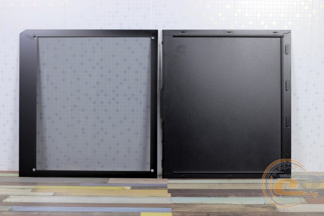 З протилежного боку розмістилася вже металева панель товщиною 0,69 мм. Вона тримається на двох гвинтах з пластиковою накатаною головкою і оснащена ручкою для полегшення демонтажу. Усередині відзначимо ребра жорсткості.