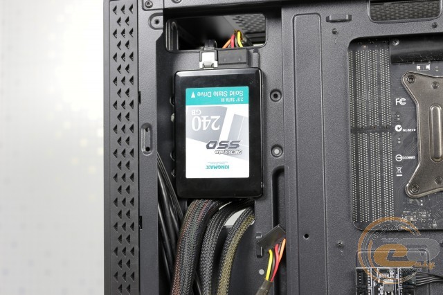 У Vinga Chaos можна встановити по парі SSD і HDD. Для 2,5-дюймових рішень знайдеться місце на піддоні для материнської плати і за ним. Жорсткі диски розташовуються в поперечному кошику. Кріплення здійснюється звичайними гвинтами з використанням комплектних гумових втулок. Але таке рішення не дозволяє розміщувати тут накопичувачі меншого формату.