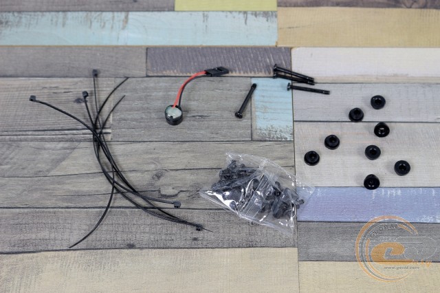 У комплекті ми знайшли стійки для материнської плати, різноманітні гвинти (для плати, накопичувачів, блоку живлення, боковин і навіть СВО), гумові втулки для накопичувачів, кілька одноразових стяжок для дротів і системний динамік.