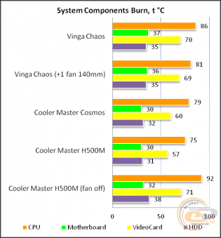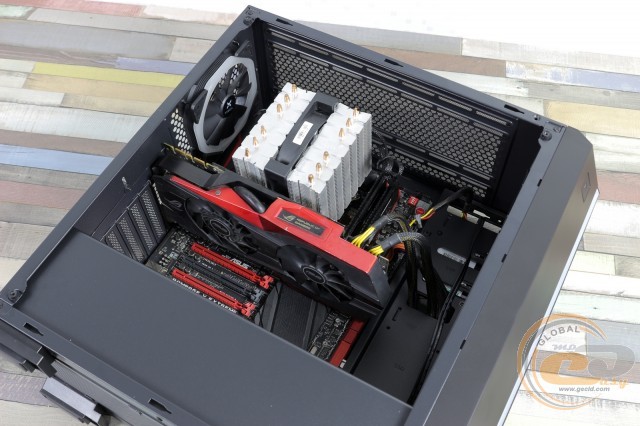 Усередині використовується сучасний двосекційний дизайн. Місця досить для самих габаритних комплектуючих. На ключових позиціях розташувалися легкознімні пилові фільтри. І навіть з одним витяжним пропелером компоненти всередині «Хаосу» відчувають себе цілком комфортно. При необхідності можна легко знизити температури, додавши пару пропелерів. Добре, що місця вистачає.