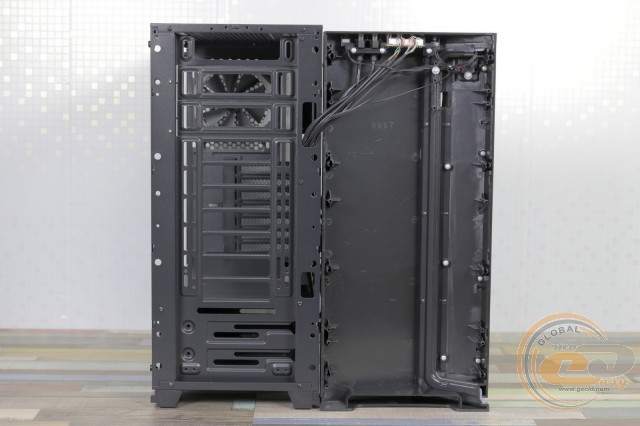 Ззаду корпус має звичне компонування з нижнім розміщенням блоку живлення. Над його посадковим місцем знаходяться сім слотів розширення, виріз для інтерфейсної панелі материнської плати і встановлена вертушка на видув з можливістю регулювання положення за висотою.