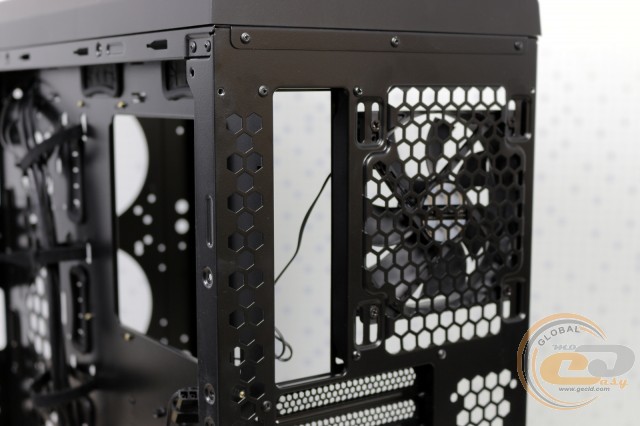 3 спереди (120мм/140мм*). Хотелось бы заметить, что спереди крепления вентиляторов очень необычное: внутрення и внешняя часть корпуса разделена металлической пластиной, на которой расположены 3 отверстия, диаметром чуть больше 120мм, что, соответственно, ухудшает эффективность 140мм вентиляторов, если они стоят спереди, тем не менее, отверстия для крепления под них есть.