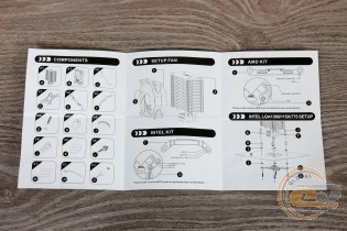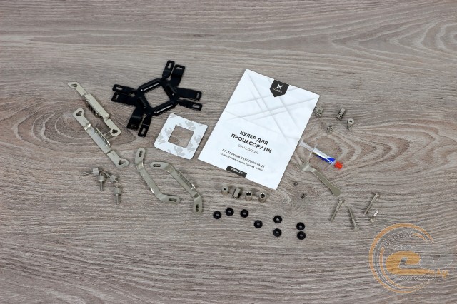 Всередині упаковки Vinga CL3008B ми знайшли металеву універсальну підсилювальну пластину, два набори кріплень для платформ AMD і Intel, шпильки, стійки, шайби, підпружинені гайки, ключик, а також маленький шприц термопасти і набір документації для користувача.