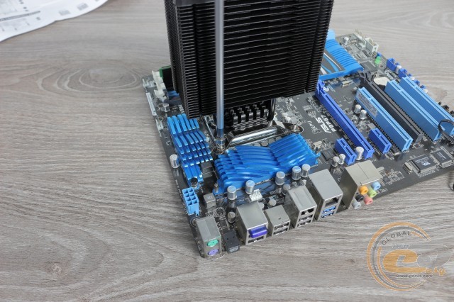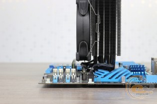 Далі закріплюємо вентилятор. Підключаємо його до відповідного роз'єму на системній платі. За фото зверху добре видно, що змонтований кулер не конфліктує з охолодженням VRM на материнській платі і першим DIMM-слотом.