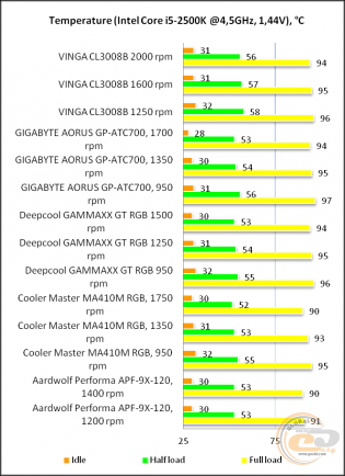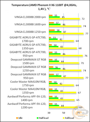 Продуктивності Vinga CL3008B досить для відводу тепла від розігнаних до 4 - 4,5 ГГц багатоядерних стендових процесорів. Щоб не допустити тротлінгу, йому вистачило майже половини частоти обертання штатної вертушки. Отже, новинка без проблем впорається з енергоефективними сучасними CPU.