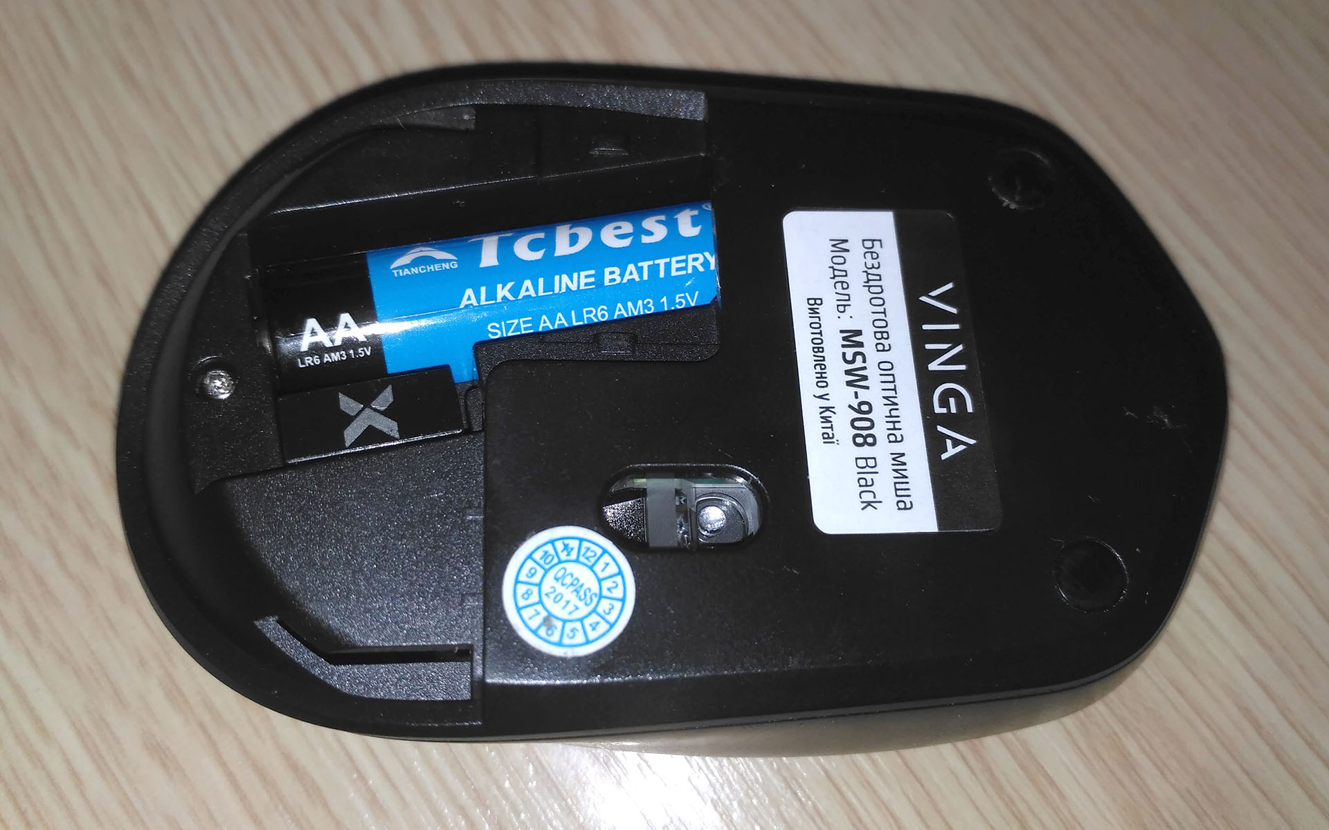 Знизу у мишки знаходиться зрушений вправо сенсор, нижче - відсік з кришкою для установки батареї і відсік для зберігання ресивера. Є також протиковзкі наклейки. В цілому, зовнішній вигляд мишки багато в чому перегукується з Logitech M335 і M535: форма, кнопки, колесо прокрутки, кнопка зміни dpi. Навіть нижня частина виконана однаково - фігурний батарейний відсік у вигляді букви "Г" і зміщений сенсор. Єдина помітна візуальна відмінність - у Logitech є тумблер включення / відключення сенсора. У Vinga це реалізовано трохи інакше. Розповім про це трохи пізніше.