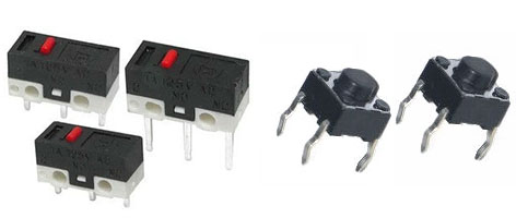 Саме ці маленькі електронні компоненти видають характерні звуки, які ми так звикли чути при роботі з мишкою. Так ось, коли я з цікавості, озброївшись пінцетом, підчепив корпус щоб дістатися до кнопки, я побачив, що натискає елемент (в Winga MSW-908 використовуються кнопки, зображені праворуч) виконаний з гуми (або схожого матеріалу) червоного кольору. Саме ця особливість дозволяє гасити звичний клік звуку і робить натискання дуже м'якими.